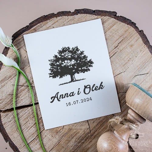 Spersonalizowany stempel ślubny z imionami oraz z datą ślubu z motywem drzewa.