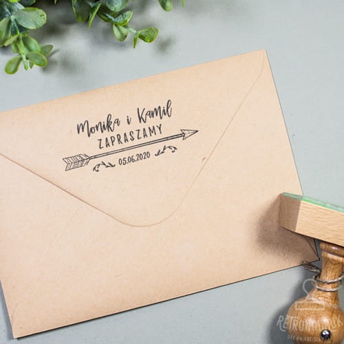 Stempel ślubny prostokątny, spersonalizowany imionami Narzeczonych i datą ślubu. Pieczątki ślubne to świetny pomysł aby w unikalny sposób oznaczyć korespondencję ślubną, zaproszenia, podziękowania, dekoracje weselne, czy prezenty dla Gości. To również świetna pamiątka ślubu dla Pary Młodej.