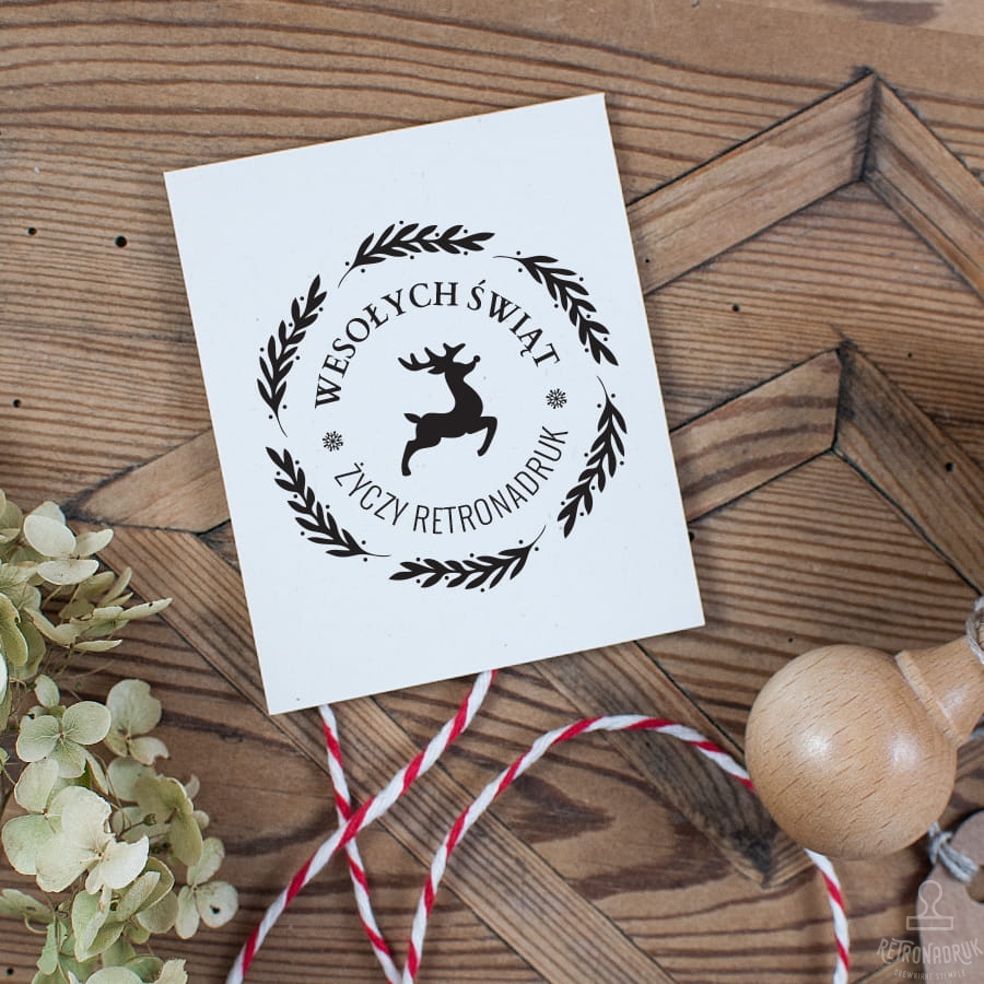 Stempel świąteczeny z motwyem jelonka do personalizacji nazwą firmy, pracowni lub marki. Drewniany stempel z motywem świątecznym to świetny pomysł na oznaczenie w wyjątkowy sposób wizytówek, opakowań, papieru firmowego, zawieszek i innych materiałów promocyjnych w okresie przedświątecznycm i świąt Bożego Narodzenia.