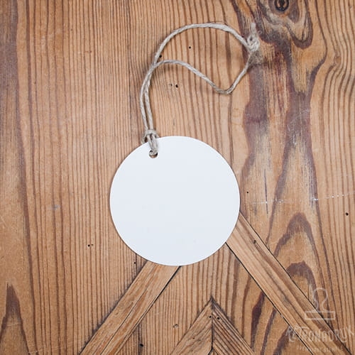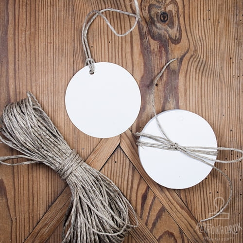 Zawieszki okrągłe wykonane z papieru białego. Doskonałe na etykiety weselne lub etykiety produktowe.