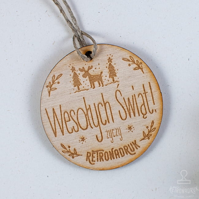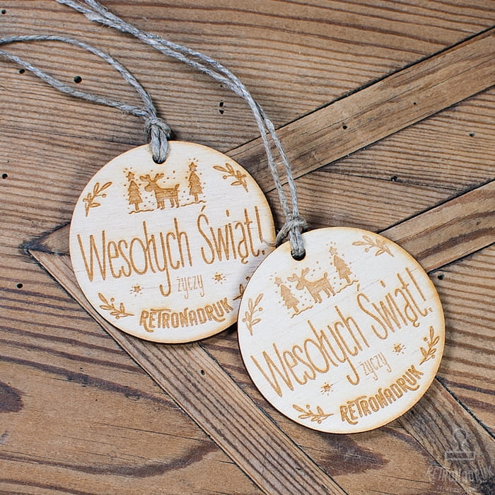 Zawieszki firmowe ze sklejki - życzenia Bożonarodzeniowe w kształcie bombki.