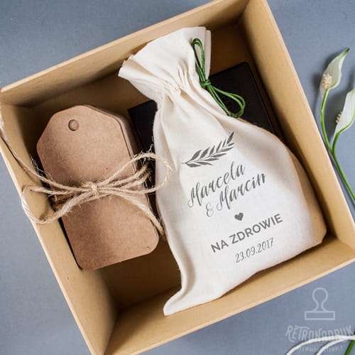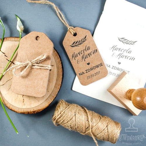 - personalizowany stempel 60x40 mm "Na zdrowie" z imionami i datą ślubu,