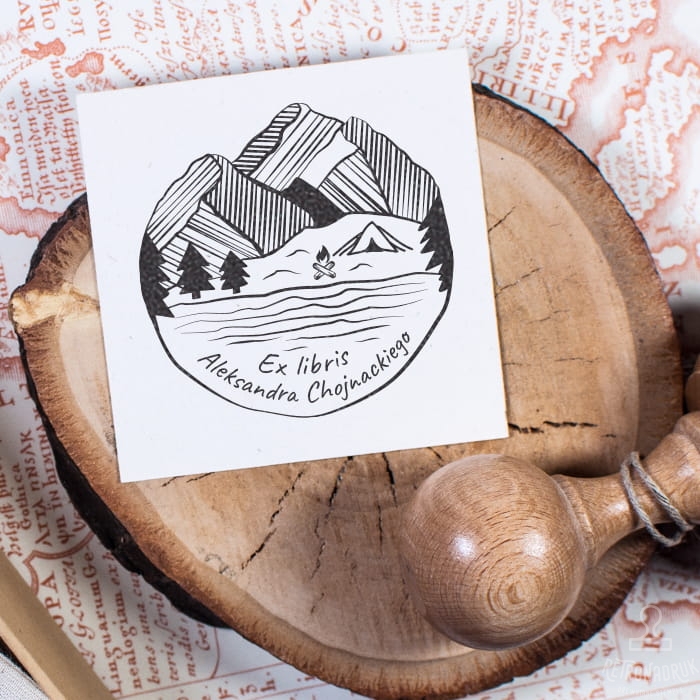 Zestaw ex libris ze stemplem do oznaczania książek dla miłośników góry i czytania. Stempel exlibris personalizowany imieniem i nazwiskiem posiadacza księgozbioru z motywem gór w zestawie na prezent dla pasjonatów gór i posiadaczy domowych biblioteczek.