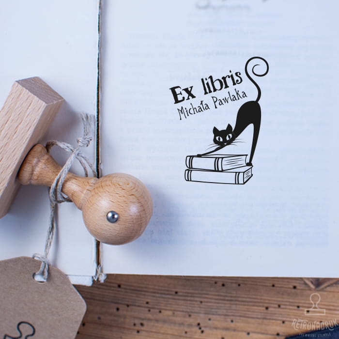 Exlibris w formie stempla retro z grafiką kota to wyjątkowy gadżet dla miłośnika książek i świetny pomysł na prezent dla posiadaczy domowej biblioteczek i wielbicieli futrzaków.