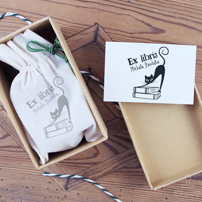 Stempel exlibris z motywem kota i książek w zestawie na prezent dla miłośnika literatury i kotów.