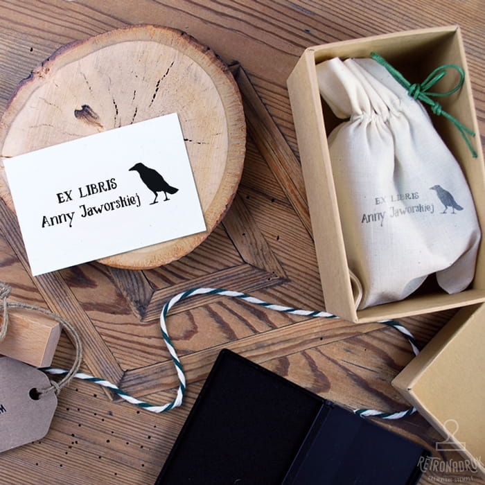 Pieczątka ex libris z motywem kruka w zestawie na prezent dla miłośnika książek.