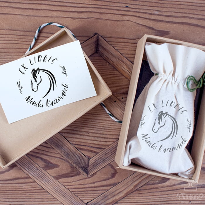 Stempel exlibris z motywem głowy konika w zestawie na prezent dla miłośnika książek i koni.