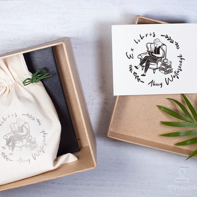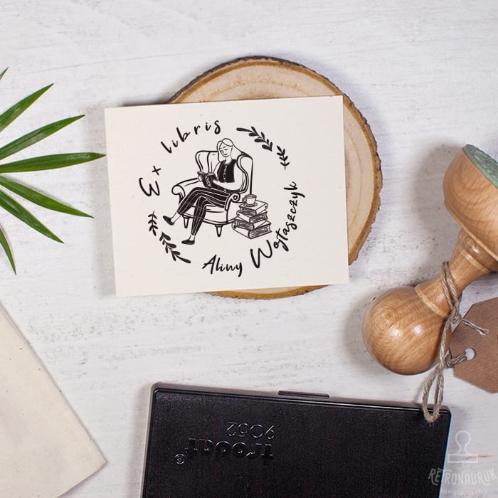 Zestaw prezentowy ex libris z czytelniczką. Stempel z motywem czytelniczki siedzącej w fotelu w towarzystwie książek i kawy. Idealny na prezent dla fanki czytania i jesieniary do oznaczania prywatnej biblioteczki.