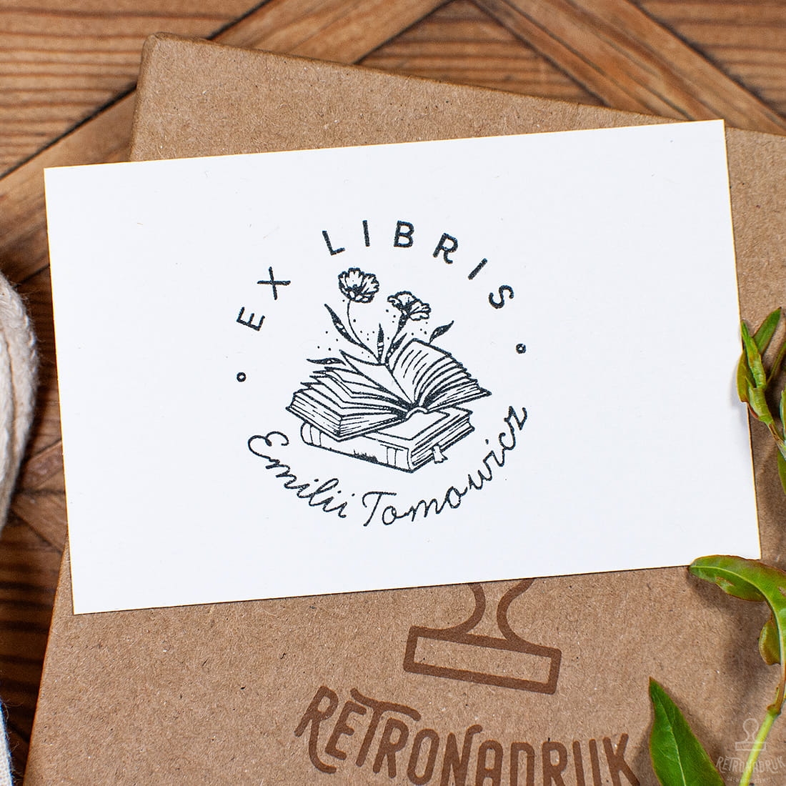 Personalizowana pieczątka Ex Libris z motywem otwartej książki, idealna do oznaczania książek. Zestaw prezentowy zawiera drewniany stempel, poduszkę z tuszem oraz stylowe pudełko retro, doskonałe dla miłośników literatury i bibliofilów.