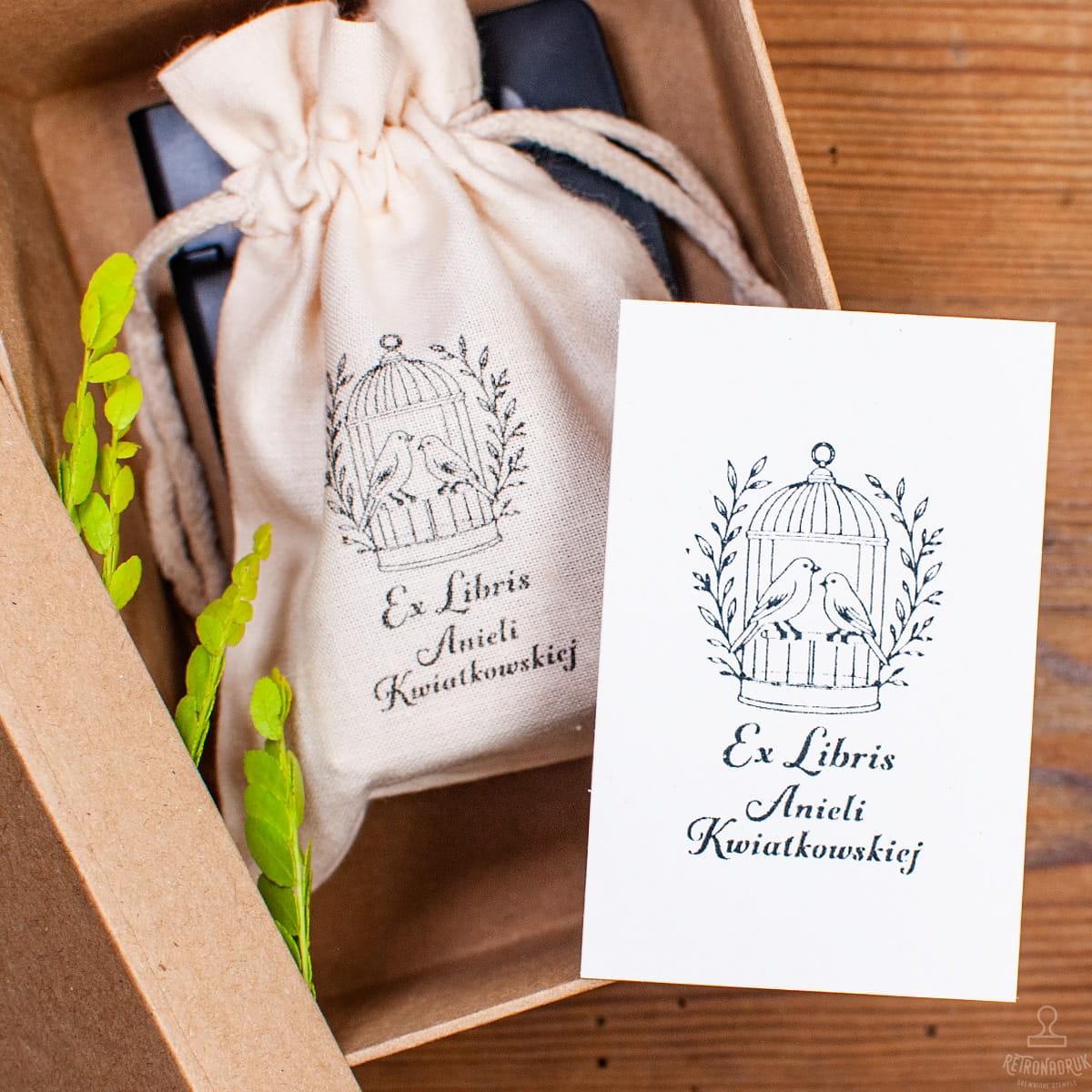 Stempel do książek z motywem kanarków w zestawie prezentowym - z tuszem, woreczkiem i pudełkiem retro. Personalizowany tekst.