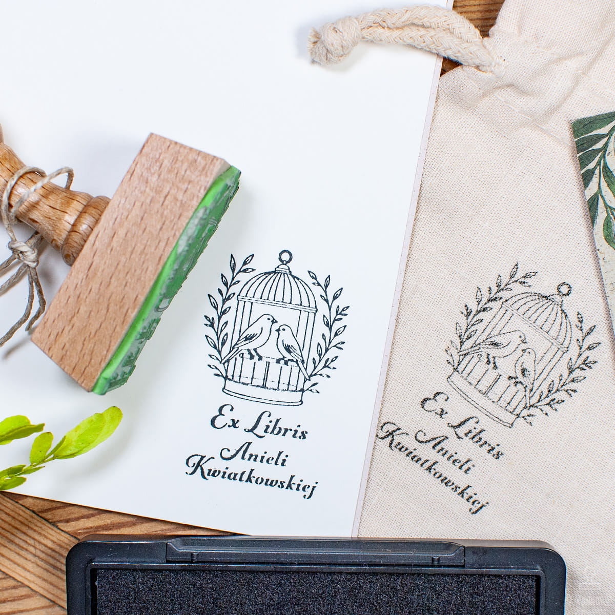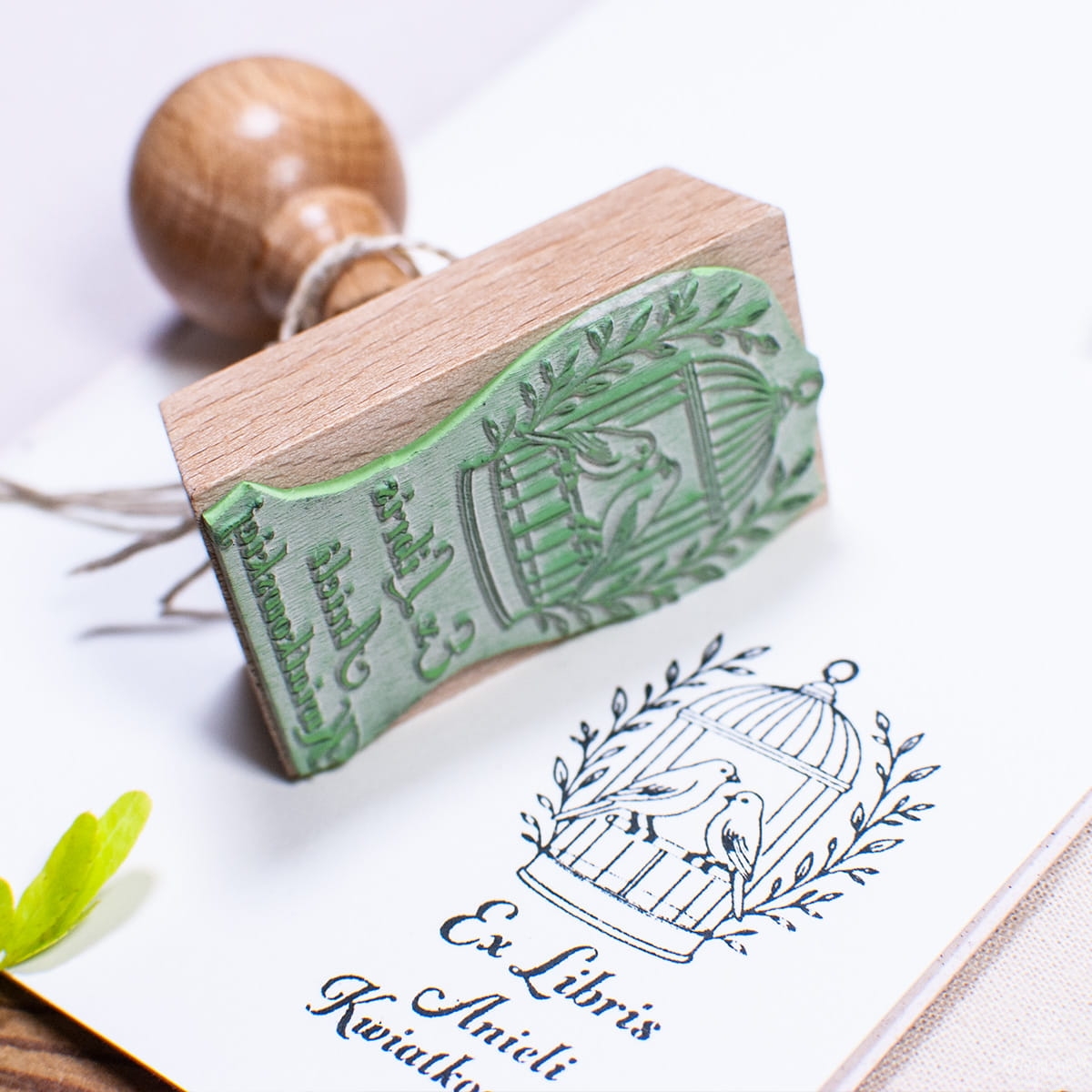 Stylowy stempel Ex Libris z motywem dwóch kanarków w klatce – zaprojektowany z myślą o miłośnikach książek i pięknych detali. Wykonany z drewna bukowego, spersonalizowany imieniem i nazwiskiem właściciela, idealnie nadaje się do oznaczania księgozbioru.