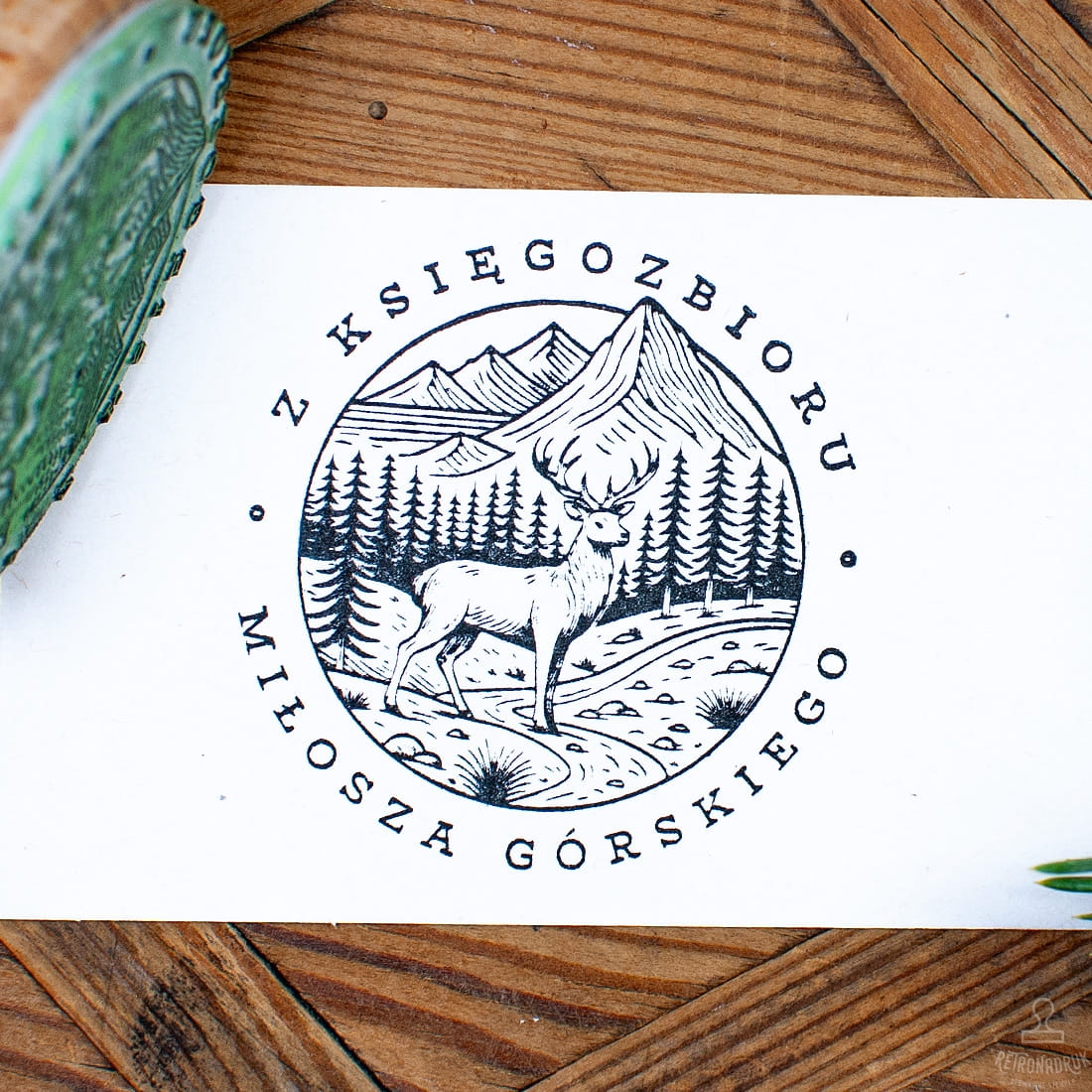 Stempel exlibris z motywem jelenia w górach – idealny dla miłośników natury, literatury i górskich wędrówek.