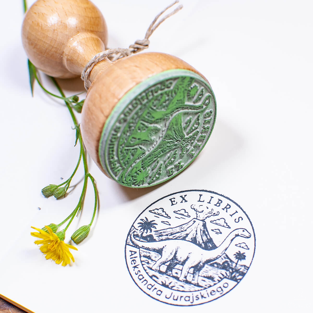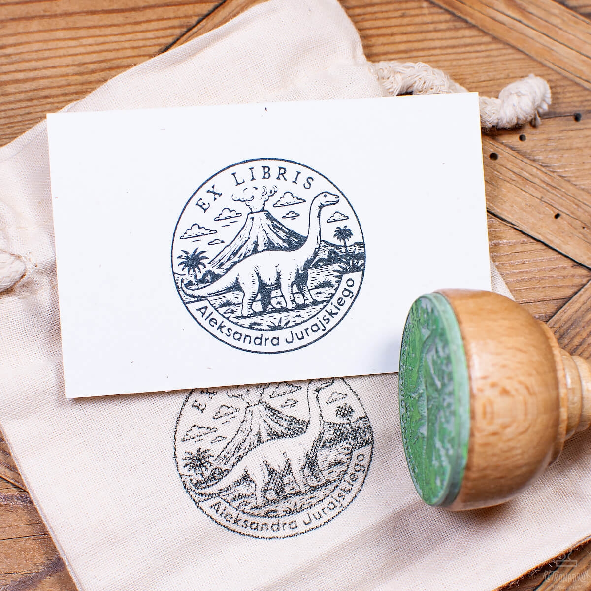 Drewniany stempel ex libris z motywem dinozaura, personalizowany imieniem właściciela. Idealny do znakowania książek.